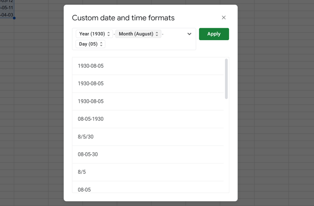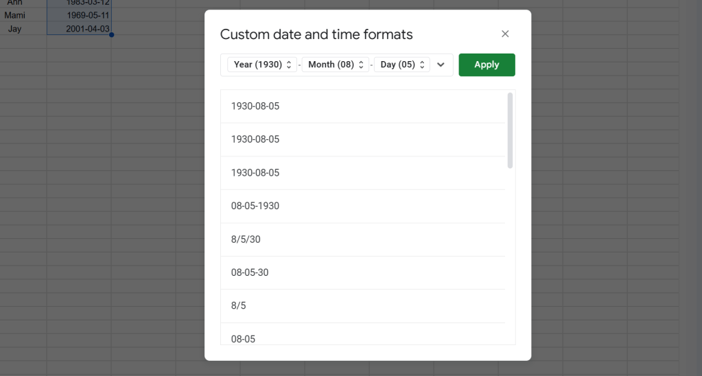 เราสามารถ highlight ข้อมูลวันที่แบบด้านบน แล้วไปปรับแต่งต่อได้ โดย click ที่ More formats แล้วเลือก Custom data and time