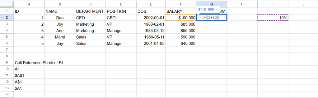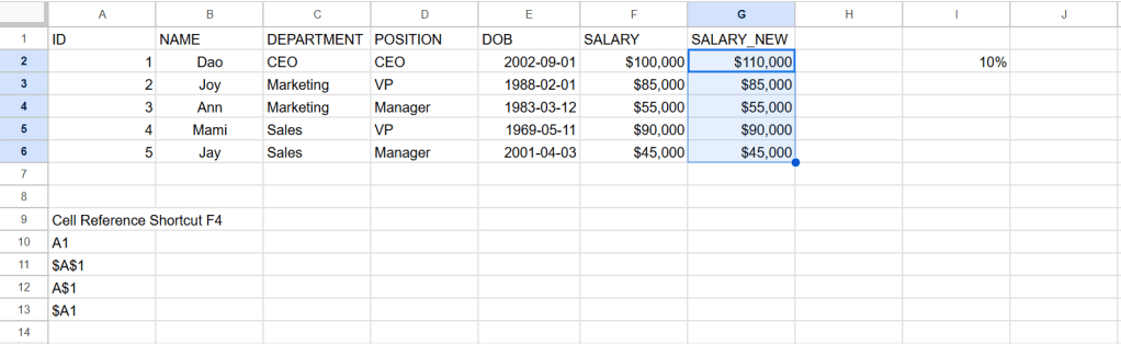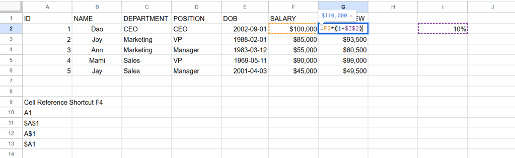 ถ้า lock cell เป็น $I$2 จะได้ค่า cell ตั้งแต่ G2 ถึง G6 เพิ่มขึ้นจาก F2 ถึง F6 cell ละ 10%