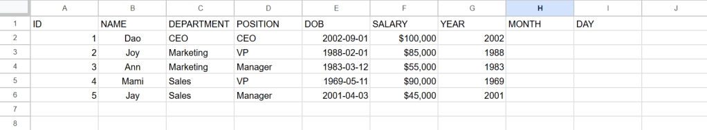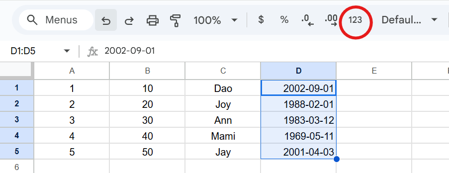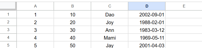 ต่อไปเราจะลองใส่ข้อมูลวันที่ เป็นวันเดือนปีเกิดของคนทั้ง 5 คนนี้