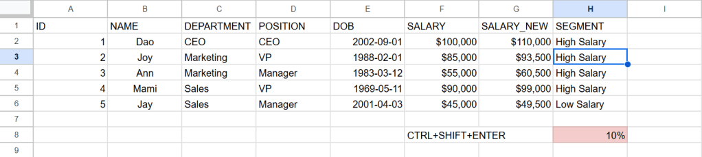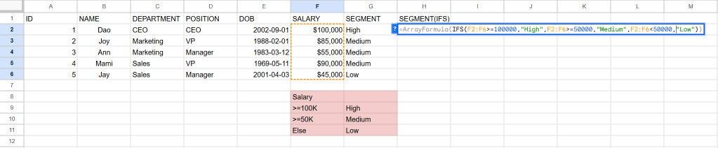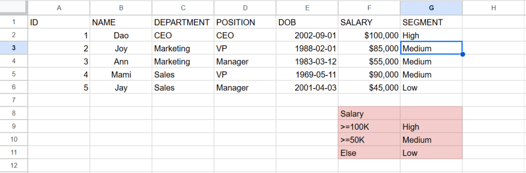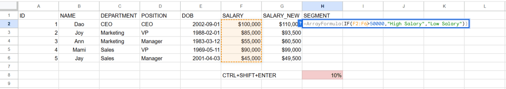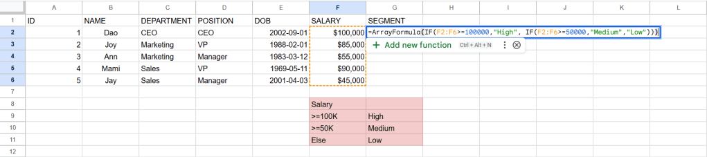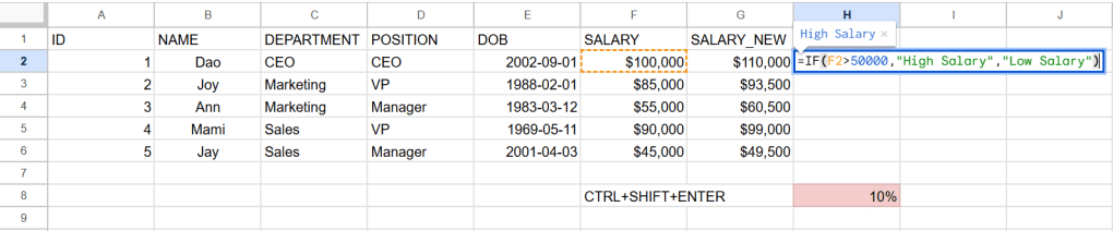 ในการใช้ function IF ในกรณีด้านล่างถ้า SALARY มากกว่า 50000 ถือเป็น High Salary แต่ถ้าไม่มากกว่า 50000 จะเป็น Low Salary
