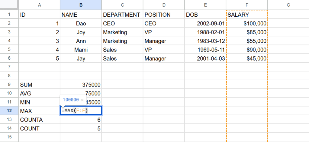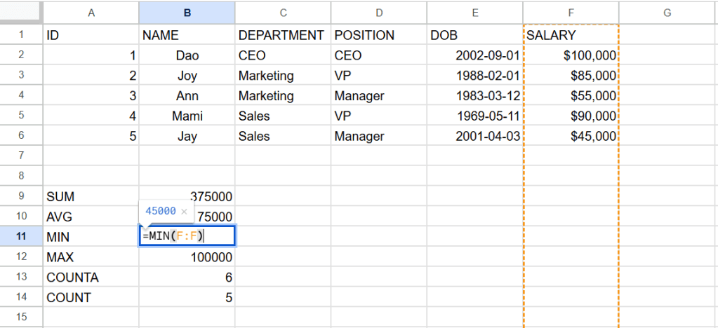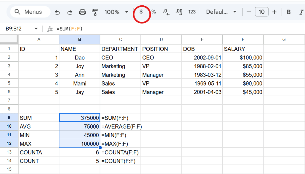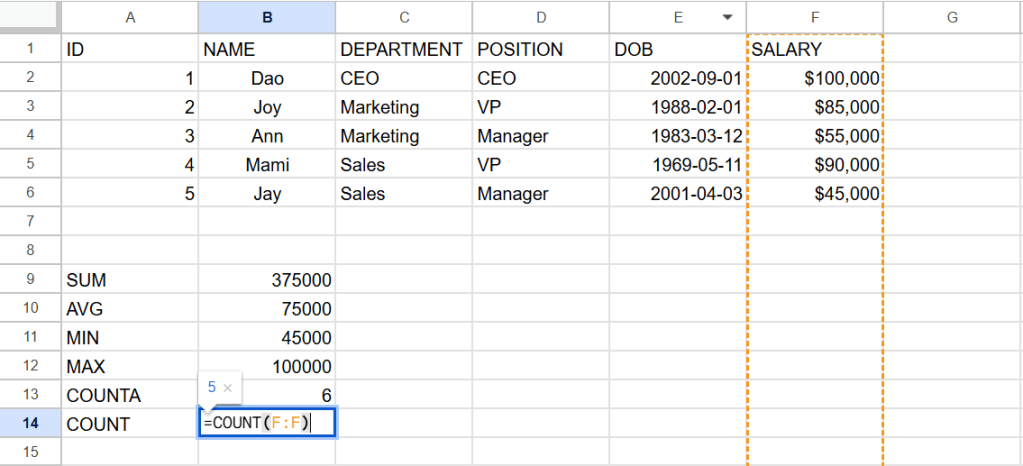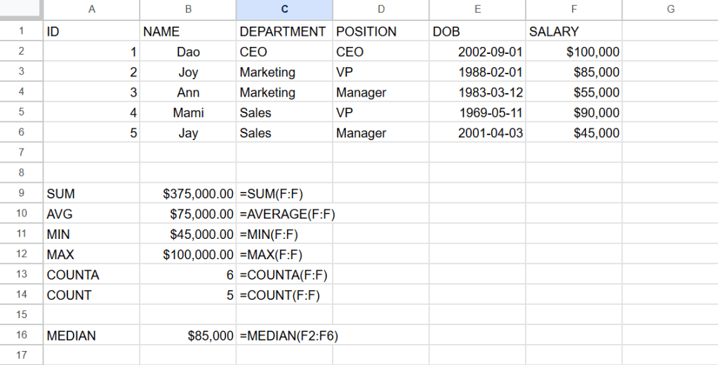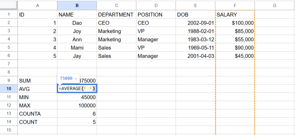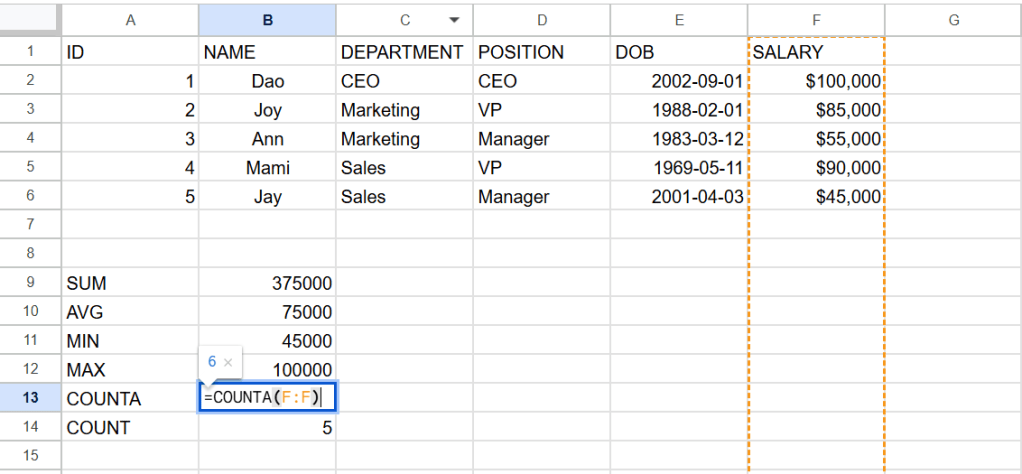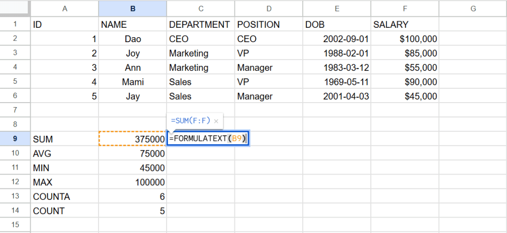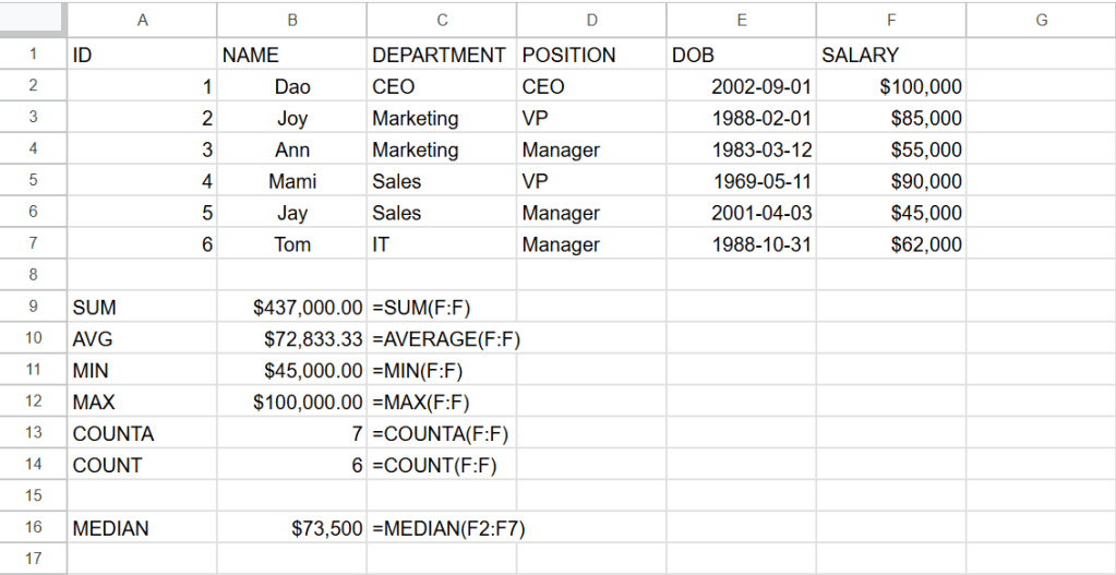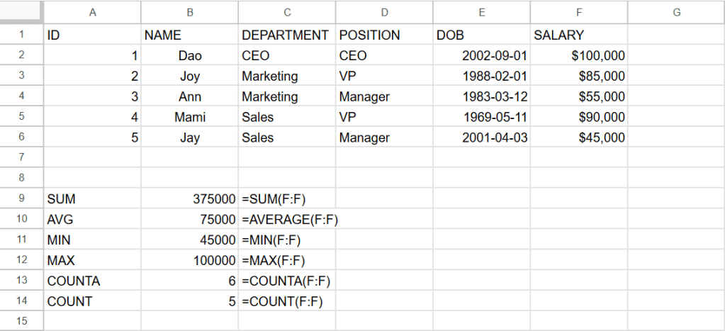 ต่อไปนี้เป็นสูตรการหาผลรวม(sum) ค่าเฉลี่ย(average) ค่าต่ำสุด(min) ค่าสูงสุด(max) จำนวนcellที่เป็นค่าตัวเลข(counta) และจำนวนcell(count)